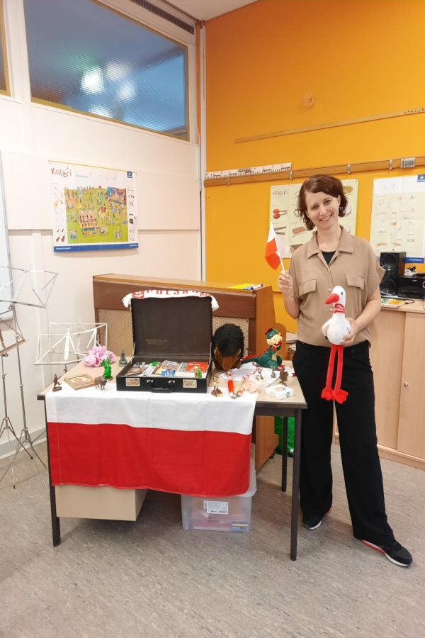Die polnische Sprache darf natürlich auch nicht zu kurz kommen, das ist dann mein Part! Ich habe somit u.a. mit den Schüler/innen geübt, wie man sich sowohl vorstellt und nach dem Namen des anderen fragt (mam na imię = ich heiße / jak masz na imię = wie heißt Du), als auch wie es einem geht (jak się masz = wie geht’s Dir). Unterschiedliche Antworten hatten verschiedene spielerische Aktionen (dobrze = gut => Daumen hoch / źle = schlecht = alle tauschen den Platz). Wir haben zudem auch ein Quiz gespielt und berühmte Personen aus Polen erfragt (ja, auch Mark Forster hat polnische Wurzeln). Die Kinder hatten sehr viel Spaß und ich fand es auch super toll. Das war ein gelungener Start!